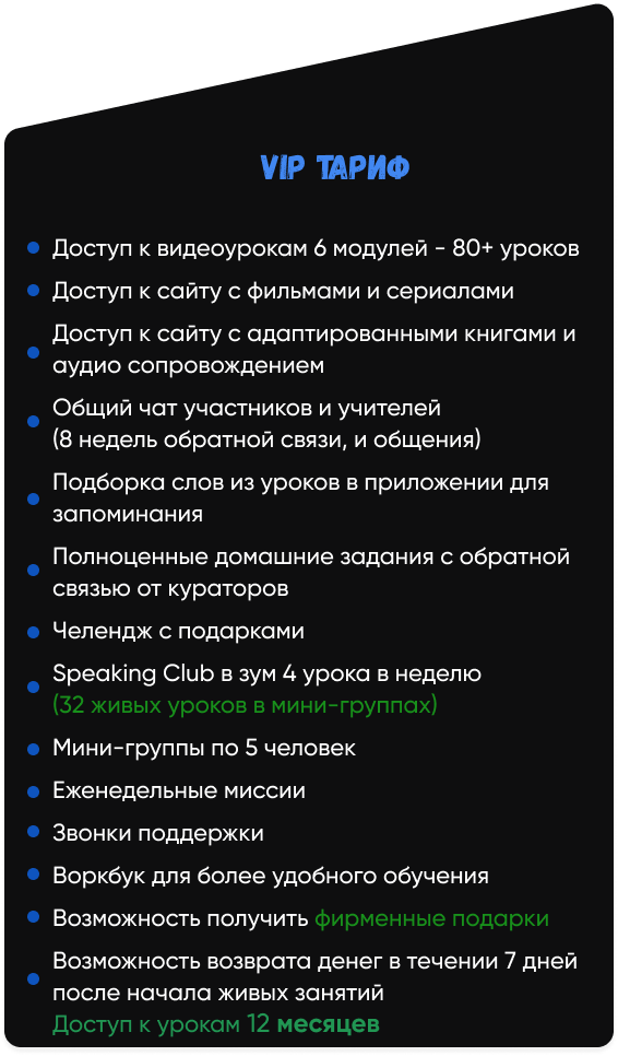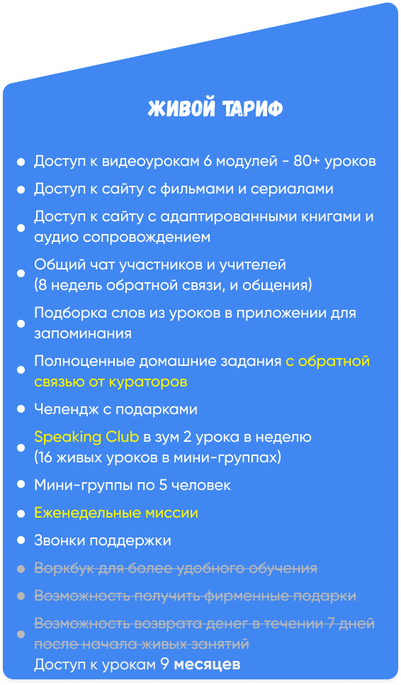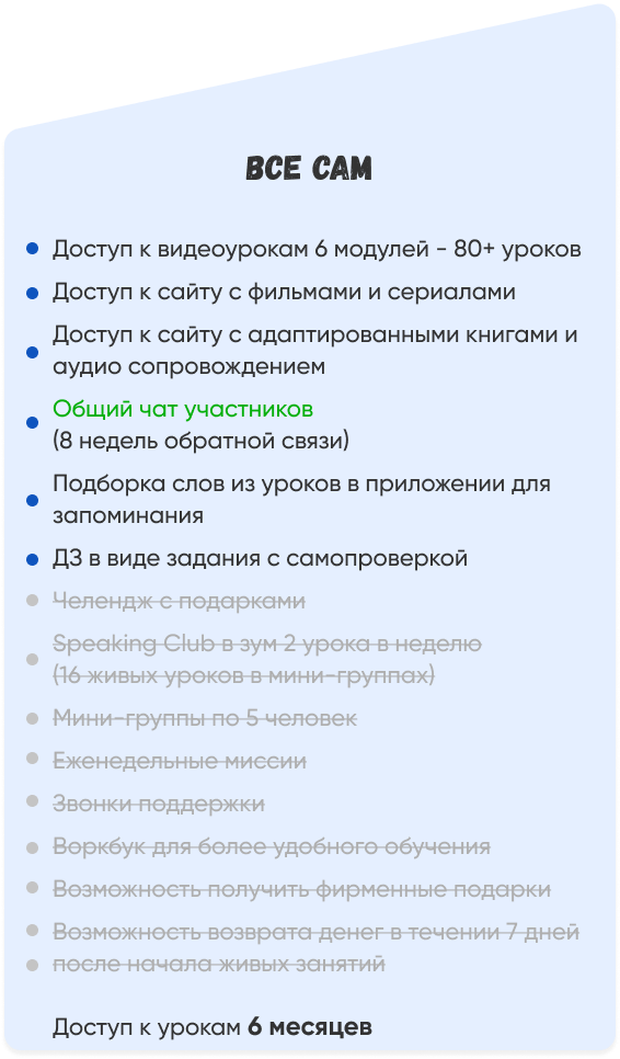 Так же вам будет предоставлен доступ на пол года к сайту с английскими фильмами и сериалами с двойными субтитрами, закрытый Telegram-чат с участниками, где мы будем общаться по английски и поддерживать друг друга.